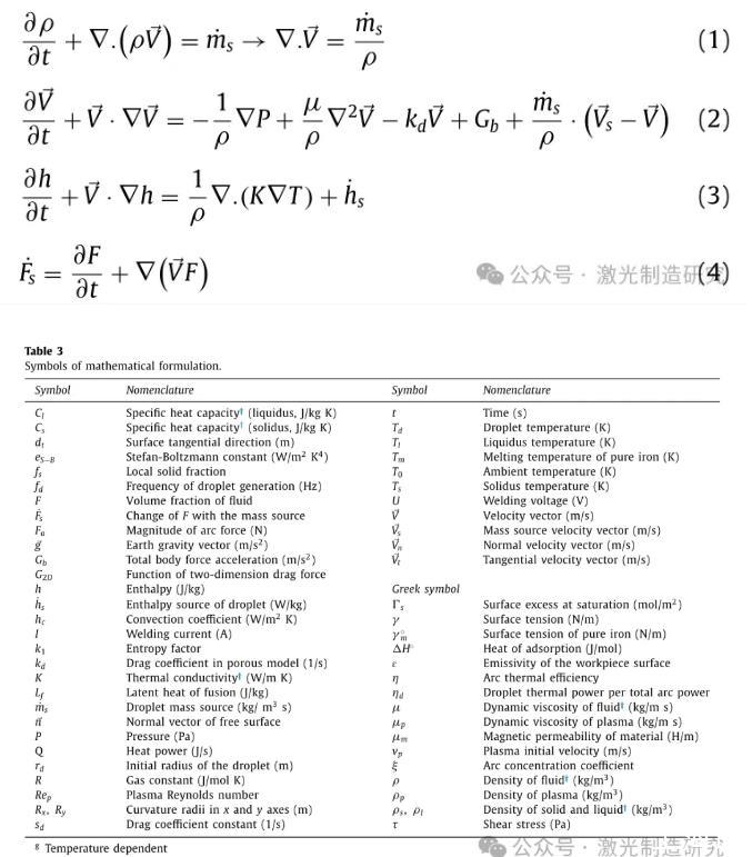 開發(fā)了一個三維笛卡爾模型來分析TP-GMAW工藝獲得的熔池中的輪廓和對流。在支持相變能力的計算域中考慮牛頓和不可壓縮流體的層流。熔池由電磁力、浮力和表面張力共同驅動。為了簡化數(shù)值模型,等離子體熱對液滴的影響通過液滴的初始溫度來考慮。根據(jù)這些假設,總共四個控制方程(包括質量連續(xù)性、動量連續(xù)性(納維爾-斯托克斯)、能量守恒和VOF)根據(jù)方程一起求解。分別為(1)至(4)。表3列出了一系列變量。為了分析熱傳遞和熔池輪廓,采用了FLOW-3D商業(yè)軟件,特別是因為該軟件通過拉格朗日VOF平流法跟蹤移動的自由表面具有很高的精度。