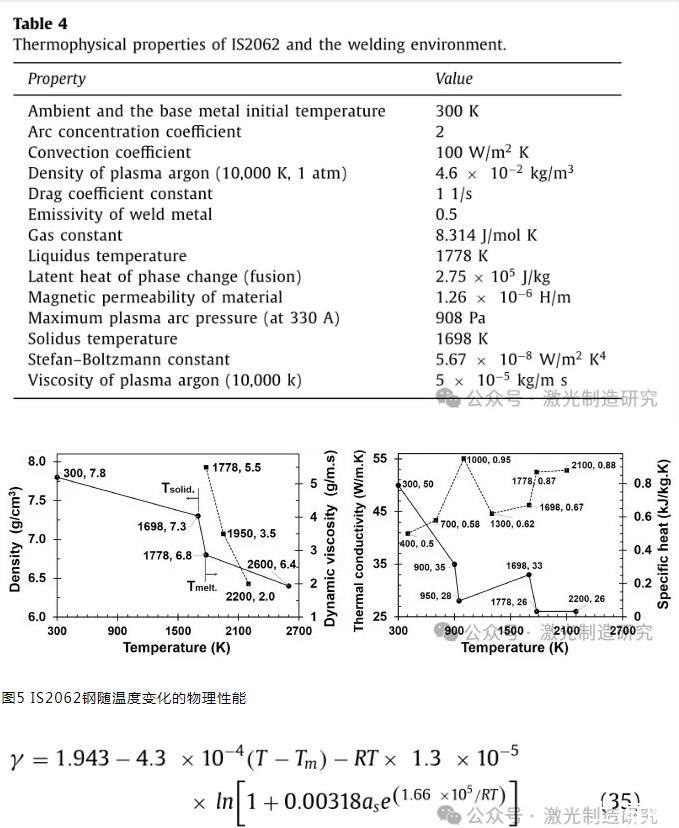 表4顯示了在該模擬中應用的IS2062鋼的熱物理性質。在溫度相關條件下考慮了相變和合金元素對不同物理性質的影響(圖5)。這些特性是從不同的數(shù)據(jù)庫中收集的,包括FLOW-3D的流體數(shù)據(jù)庫和其他關于低碳鋼的文獻。自由表面的表面張力被定義為假二元Fe–S系統(tǒng)中溫度和硫含量的函數(shù):