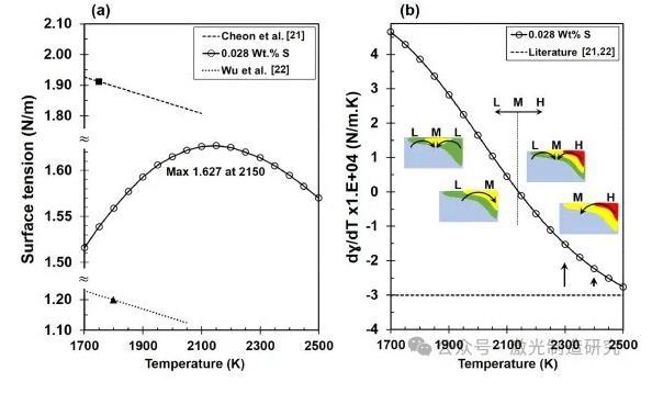 圖6表面張力(a)及其梯度(b)是溫度和硫重量%的函數(shù)。關于中間范圍(M)的轉變溫度,高溫和低溫分別用字母H和L標記