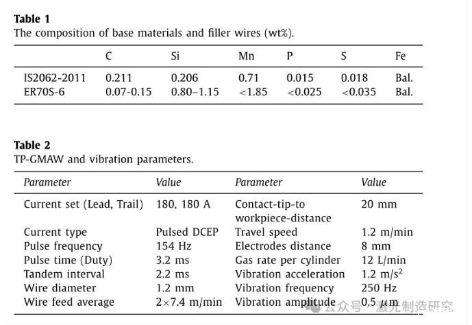 在IIT海得拉巴使用機器人TP-GMAW設施進行焊接實驗,其中兩個電極分別通過焊槍饋送并從兩個獨立的電源接收電力。電源以反相方式同步,以防止后電弧和前電弧之間的相互作用。氬氣82%–二氧化碳18%用作保護氣體。機器人焊接設備由KUKA公司的KR30六軸機器人組成,該機器人與Fronius公司的兩個數(shù)字焊接電源相連。跟蹤電極和引導電極的電流設置為180 A.通過保持焊槍垂直于工件,在平面位置進行長度為200 mm的堆焊。本研究中使用的基材是由鐵素體-珠光體結構組成的熱軋低碳鋼IS 2062-2011。絲狀電極是直徑為1.2毫米的ER 70-S。母材和焊絲的化學成分列于表1。使用容量為150±0 kgf的Sdyn電動振動機來產生振動。