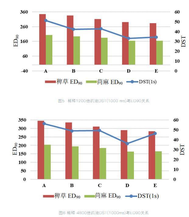 對于除草劑而言,藥液表面張力低于植物葉面潤濕臨界值大概25 mN/m,藥液就可以由氣孔直接滲入表皮。對于稀釋600倍條件下,D配方的動態表面力為23.14 mN/m,已經低于雜草葉面的臨界值,那么藥液勢必更有效地滲透,藥效會更高,尤其對于葉片厚,蠟質層稍厚的闊葉雜草會更加明顯。對于稀釋600倍條件下,E配方的動態表面張力為31.28 mN/m,略高于葉面的臨界值,可能對于闊葉雜草的防效會有所下降。把藥液表面張力與靶標表面張力關聯,可以初步看出,藥液表面張力越接近雜草葉面臨界表面張力值,藥液防效會越優秀,當偏離程度大時,除草活性會受到明顯影響。