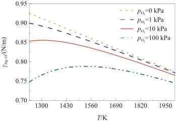 圖6研究了在不同氧氣壓力條件下,γAg-O隨溫度的變化關系。由圖可知,當氧氣壓力低于10 kPa時,γAg-O與溫度呈負相關。而當氧氣壓力高于10 kPa時,隨著溫度升高,γAg-O呈現先增大后減小的趨勢,并且隨著氧氣壓力增加,這種轉變幅度增大。這是因為γAg-O受溫度和氧溶解度的共同影響。一方面,隨著溫度升高,液態Ag的表面張力(γAg)降低,從而導致γAg-O降低;另一方面,液態Ag-O系中的氧溶解度與溫度呈負相關,當溫度升高時氧溶解度下降,導致表面氧吸附量減少,進而引起γAg-O增加。因此,當溫度較低時,氧溶解度成為影響γAg-O的主要因素;而在較高的溫度條件下,溫度成為主要因素。