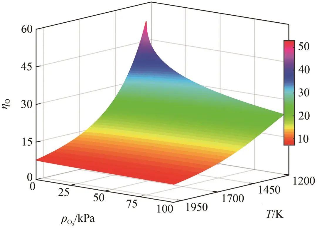 由圖7可知,當溫度低于1500 K時,ΓO,Ag隨氧氣壓力升高顯著增加;當溫度高于1500 K時,由于液態Ag-O系中的氧溶解度顯著降低,ΓO,Ag隨氧氣壓力的增加,其增加幅度減小。觀察圖8可知,η隨著溫度和氧分壓的升高而呈現下降趨勢。這是因為式(27)中的表面偏析平衡系數KII與溫度呈負相關,當溫度升高時KII減小,導致表面氧濃度降低。此外,在較低的氧分壓條件下,O原子傾向富集于表面;當氧分壓升高時,更多的O原子溶入液態Ag-O系中,引起η減小。