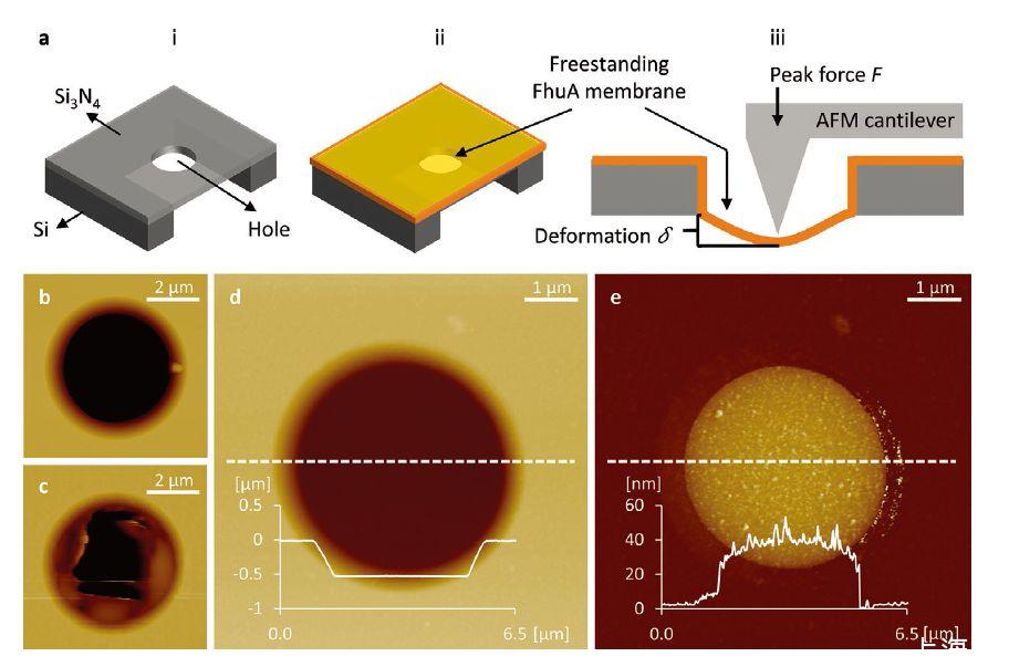 圖4、在FhuA單層膜上的AFM測量.a)當(i)未覆蓋和(ii)覆蓋有FhuA膜時在其中心具有單個孔的氮化硅膜窗口的示意圖.(iii)在PeakForce QNM模式下AFM成像期間FhuA膜涂覆的氮化硅膜窗口的橫截面(b-d)當(b)孔未被FhuA膜覆蓋,(c)孔被破裂的FhuAΔCVF膜覆蓋時,氮化硅膜窗口中的孔的AFM高度圖像膜,和(d)孔被一個完整的FhuAΔCVFtev膜層覆蓋(d)和(e)中的高度和變形圖像是同時獲得的,并且所有圖像都是在水中測量的。(d)和(e)中的高度和變形曲線分別屬于圖像中的虛線。
