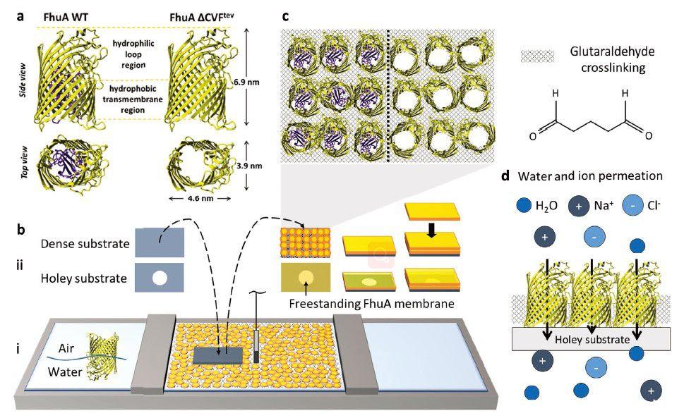 圖1、跨膜蛋白FhuA的交聯2D膜片。a)使用β-桶蛋白FhuA(跨膜蛋白鐵羥酸鹽攝取蛋白組分A)的兩種變體。在FhuA WT中,軟木結構域阻塞大部分孔內部,而該軟木結構域被生物技術去除以形成開孔變體FhuA?CVF電子伏特兩種FhuA變體具有相同的尺寸,并且其特征在于蛋白質上部的親水性環區和蛋白質下部的疏水性跨膜區。b)應用Langmuir技術形成超大2D FhuA膜片。(i)由于它們的兩親性,當擴散到空氣-水界面時,FhuA分子占據很大程度上直立的取向。(ii)當在朗繆爾槽的屏障之間緊密壓縮并與戊二醛交聯時,FhuA膜片可以通過重復的水平浸漬層疊在基底的頂部。c)由FhuA WT(左)或FhuA?CVF制成的膜的示意性俯視圖電子伏特d)FhuA膜在水和離子滲透方面進行表征。