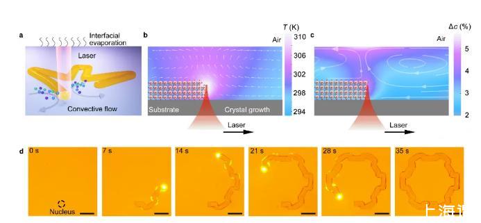 研究者利用COMSOL模擬了激光照射下鈣鈦礦晶體周圍的局域過飽和度,并通過實驗驗證了過飽和度產(chǎn)生的原理。其中馬倫格尼對流的引入加速了傳質(zhì)過程,使得鈣鈦礦結(jié)構(gòu)能夠在激光誘導(dǎo)下快速生長,在實驗中,MAPbBr3鈣鈦礦單晶的生長速度可達0.1 mm/s,顯著快于傳統(tǒng)的鈣鈦礦單晶制備方法。激光閾值功率約為150μW,低于現(xiàn)有的激光調(diào)控鈣鈦礦結(jié)晶過程方法。
