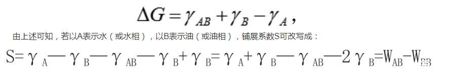 2、液-液界面。第一種情況,黏附過程形成的界面,黏附功,γA代表液體A的表面張力;γB分別代表液體B的表面張力;γAB為代表液體A和液體B的液液界面張力,WAB則代表為黏附功,黏附功反映的是不同液體間的相互吸引強度。當WAB>0時,黏附過程可以自發進行。此時該液體的親水性較好。第二種情況,鋪展過程形成的界面,則,S為鋪展系數,若S>0,則體系的鋪展過程能自發進行。此時該液體的親水性較好。第三種情況,分散過程形成的液液界面,F=-ΔG=—γAB,F為分散系數,當F>0時,分散過程可以自發進行,那么在其他條件相同,可以判斷分散過程能夠自發進行的物質親水性好于不能自發進行的物質。