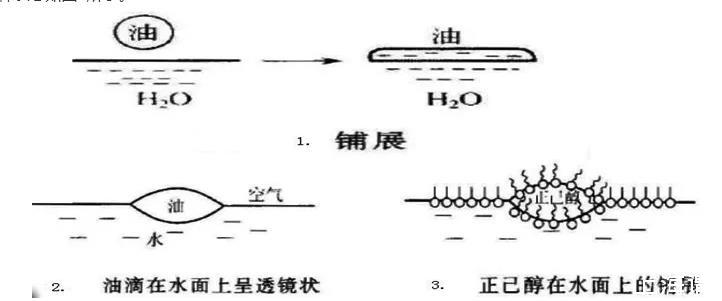 第二種方式,鋪展方式。在上述的液-固界面的潤濕作用,液體在固體表面的鋪展也可以引用到液液界面,不過此時的鋪展過程復雜一些。比如在清潔的水面上,滴加不溶性“油”滴,此時的“油”在水面上,可能表現出三種不同的狀態: