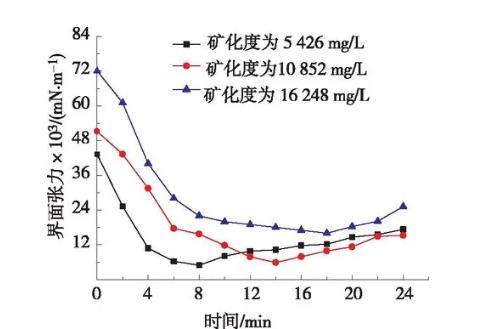 體系耐鹽性直接影響其驅油效果。在油藏溫度80℃條件下,測定DQ-2在不同礦化度條件下的油水界面張力,實驗結果見圖3。