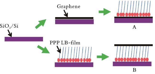 石墨烯作為一種新型二維超薄碳材料,易于吸附分子,是天然的襯底。當某些分子吸附在石墨烯表面時,分子的拉曼信號會得到明顯的增強,這種拉曼增強效應被稱為石墨烯增強拉曼散射效應(GERS)。X.LING等為了進一步證實GERS中的化學增強機制,使用LB技術構建了原卟啉Ⅸ(PPP)的單層或多層有序聚集體以及與石墨烯接觸的PPP的可控分子構型(見圖1)。