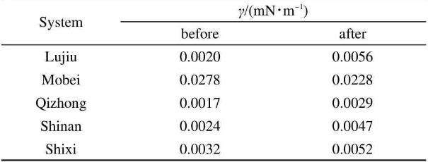 表2克拉瑪依油田中石英砂吸附前后體系的界面張力