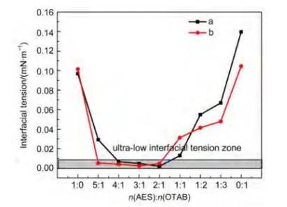 AES/烷基季銨鹽CTAB摩爾比為1:1的混合體系的β參數(shù)計(jì)算結(jié)果為~20.4,表明AES與烷基季銨鹽CTAB親水基間具有極強(qiáng)的吸引作用。值得注意的是,該體系還具有很高的溫度穩(wěn)定性,在55°C時(shí)仍能保持30 mN·m-1以下的表面張力。這說(shuō)明在較高溫度時(shí)該體系的分子排列仍然較為緊密,這和陰陽(yáng)離子表面活性劑體系中分子因靜電吸引造成的緊密排列是密切相關(guān)的??紤]到油水界面張力同樣與界面上的分子排列有關(guān),因此有可能在溫度較高時(shí)實(shí)現(xiàn)超低界面張力。