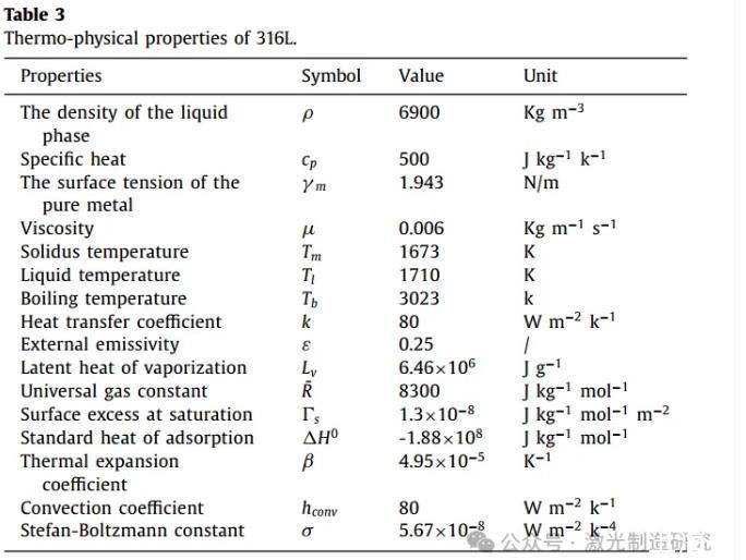 圖1(A)中顯示了計(jì)算領(lǐng)域的圖形說明。計(jì)算域的大小設(shè)置為20 mm×2 mm×25 mm。計(jì)算域劃分為1.25億個(gè)邊長為0.02 mm的六面體網(wǎng)格。在初始狀態(tài)下,將厚度為20 mm的下部設(shè)置為工件層(階段2),將厚度為5 mm的上部設(shè)置為環(huán)境空氣層(階段1)。前壁(Y=0)被設(shè)置為對(duì)稱邊界條件,頂面(Z=25 mm)被設(shè)置為壓力輸出邊界條件,其他表面被定義為壁邊界條件。使用了Ansys-FLUENT®軟件用于模擬。采用C語言編寫的用戶自定義函數(shù)(UDF)實(shí)現(xiàn)光線跟蹤過程。圖1(B)顯示了光線追蹤過程的驗(yàn)證案例,在該案例中,一束平行光束被射入具有不同表面粗糙度的方腔。圖1(C)表明,在高Ra條件下,隨著表面粗糙度的變化,能量分布明顯改變,更多的能量集中在第一反射區(qū)。表3列出了模擬中使用的物理特性。