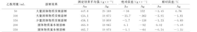 實驗樣品金含量463.8 g/t,銀含量20 037 g/t,進行除鉍用酸量的實驗,試驗用酸為乙酸(1+1),結果見表5,從結果可以看出50、100 mL乙酸用量,大部分固體物質沒被溶解,大部分鉍沒被除去,乙酸用量200 mL時,固體物質基本被溶解,結果較準確,可以滿足測定要求。在結果準確的情況下選擇用量少的,所以實驗選擇乙酸用量為200 mL。