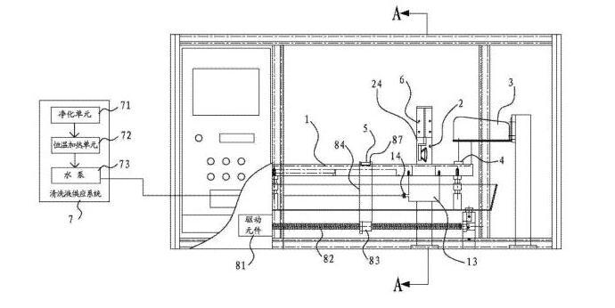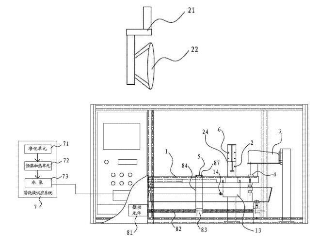 [0018]在一些實(shí)施方式中,還包括清洗液供應(yīng)系統(tǒng),清洗液供應(yīng)系統(tǒng)包括凈化單元、恒溫加熱單元和泵體。清洗液通過(guò)凈化單元凈化并通過(guò)恒溫加熱單元進(jìn)行加熱后,再經(jīng)由泵體供應(yīng)到清洗槽當(dāng)中。其有益效果是,先通過(guò)凈化單元,可以預(yù)先清除掉清洗液當(dāng)中可能存在的油。另外,通過(guò)恒溫加熱單元可以將清洗液加熱到一定的溫度。因?yàn)闇責(zé)釥顟B(tài)的清洗液,可以實(shí)現(xiàn)更加的油脂清除能力,從而可以將樣品上的油更方便且更完全的清洗下來(lái)。