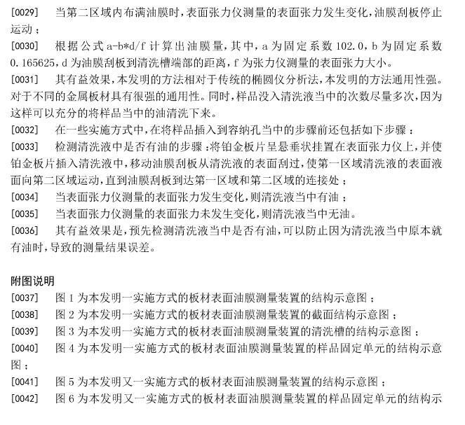[0014]同時(shí)由于樣品固定單元是位于第一區(qū)域上方的,所以當(dāng)油清洗下來(lái)的時(shí)候,首先是在第一區(qū)域的清洗液面擴(kuò)散開(kāi)來(lái)形成油膜。當(dāng)油膜刮板從第一區(qū)域的一端向著第二區(qū)域方向運(yùn)動(dòng)的時(shí)候,油膜就會(huì)向第一區(qū)域運(yùn)動(dòng),當(dāng)?shù)谝粎^(qū)域內(nèi)聚滿油膜的時(shí)候,表面張力儀就會(huì)通過(guò)鉑金板片感應(yīng)到清洗液表面張力的變化,此時(shí)油油膜刮板停止運(yùn)動(dòng),計(jì)算出整個(gè)油膜的面積。為了方便計(jì)算油膜的面積,可以在清洗槽的邊沿上設(shè)置相應(yīng)的刻度,同時(shí)將油膜刮板設(shè)置成與清洗槽的邊沿相垂直。最后根據(jù)公式a-b*d/f計(jì)算出油膜量,其中,a為固定系數(shù)102.0,b為固定系數(shù)0.165625,d為油膜刮板到清洗槽端部的距離,f為張力儀測(cè)量的表面張力大小。