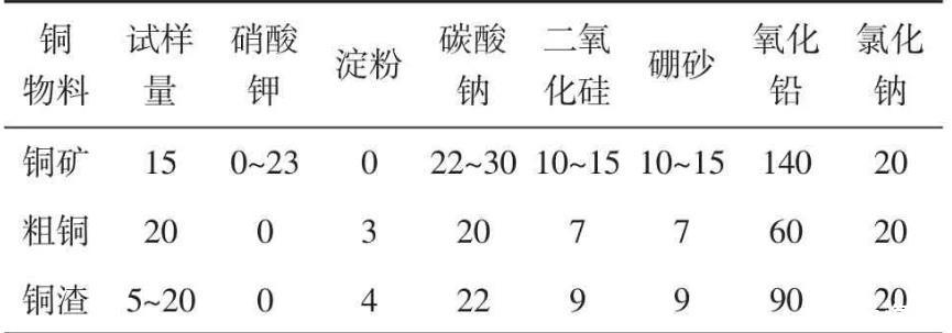 配料前可根據待測物組分確定熔渣的硅酸度,然后計算各熔劑的需要量。同時根據試樣還原力試驗結果(或理論計算試樣的還原力)調整氧化劑或還原劑加入量。通過優選實驗,推薦含銅物料的配料可按表1進行。