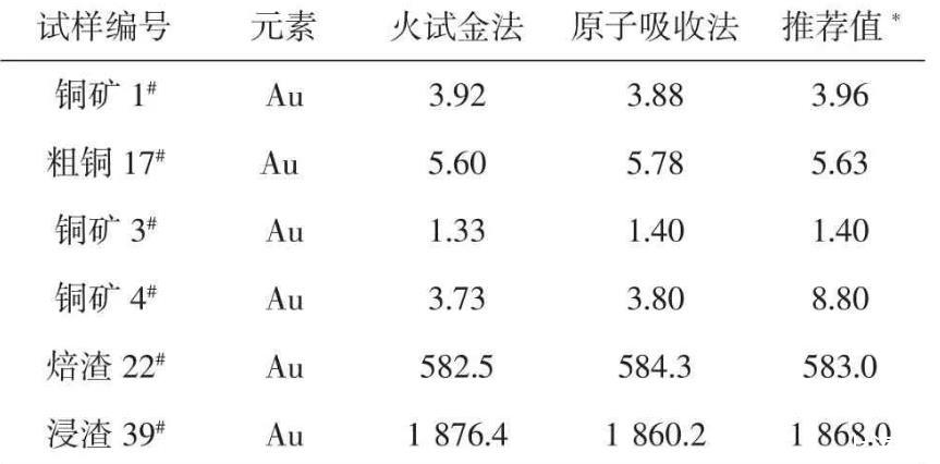 按試驗方法,用不同含量的銅物料樣品進行分析,并與其它測定金元素方法的分析結果對照,結果見表5。