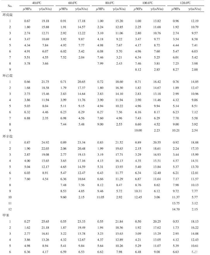 本文采用懸滴法測定了CO2-環戊烷/環己烷/環辛烷/甲苯/乙苯/乙基環己烷的界面張力,測量范圍為40~120℃,0.27~14.70 MPa。探討了壓力、溫度、碳原子數以及分子結構對界面張力的影響并提出了計算CO2-原油組分界面張力的經驗方程。得出以下結論。