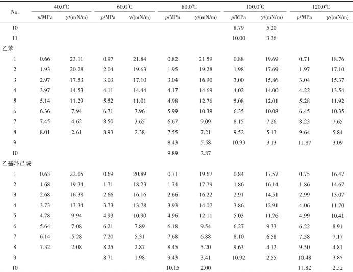 為探究相同碳原子數、不同結構的影響,選取60℃下CO2-乙基環己烷/乙苯體系進行比較。由圖7可以看出,兩種體系的界面張力下降趨勢基本相同,但CO2-乙苯的界面張力略高于CO2-乙基環己烷體系。姬澤敏等、Nagarajan等曾對CO2-苯/環己烷體系的界面張力進行過測定,發現兩種體系界面張力隨壓力變化的等溫線幾乎重合,而CO2-乙基環己烷/乙苯體系界面張力差異明顯。從分子層面考慮,這是由于乙苯的極性比乙基環己烷大,從而導致乙苯分子間的相互作用更強,處于界面層的乙苯分子更難擴散到CO2中去,使得CO2-乙苯體系的界面張力大于CO2-乙基環己烷體系。
