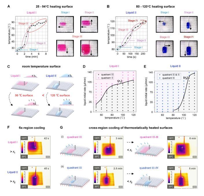 在熱交換應(yīng)用中,溫度導(dǎo)致的液體性質(zhì)變化是一個(gè)廣泛存在的現(xiàn)象,給傳統(tǒng)的液體操縱表面在高溫環(huán)境下的應(yīng)用帶來了挑戰(zhàn)。本研究提出的結(jié)構(gòu)化表面能在高溫環(huán)境下有效維持對(duì)液體的定向運(yùn)輸。并在高溫導(dǎo)致的液體表面張力變化下,完成了在持續(xù)變溫表面上對(duì)液體運(yùn)輸方向的智能調(diào)控,和在恒溫加熱表面上時(shí)空可控的靶向冷卻(圖4)。這種基于溫度調(diào)控液體性質(zhì)的智能液體運(yùn)輸能力,為按需熱管理提供了新的解決方案。