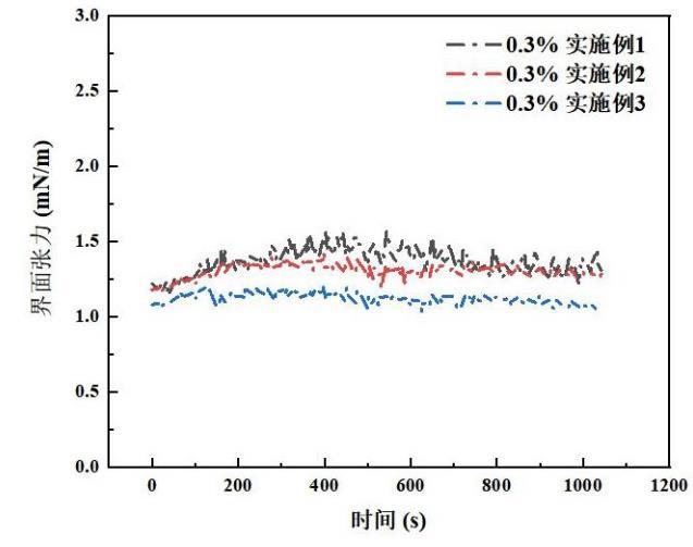 采用克呂士SDT旋轉(zhuǎn)滴界面張力儀分別測量原油(粘度723.7 mPa·s)滴入各實(shí)施例的地層水溶液后的界面張力(IFT),其中,各實(shí)施例在地層水中的質(zhì)量濃度為0.3%,并將原油滴入地層水中作為對照組進(jìn)行測量,測得對照組界面張力為21.6mN/m,其余各實(shí)施例測量結(jié)果如圖所示。可以看到,原油與三種實(shí)施例溶液混合后的體系的IFT可降低至1.25~1.46mN/m,證明了硅基納米原位乳化減阻劑具有良好的界面張力降低效果。