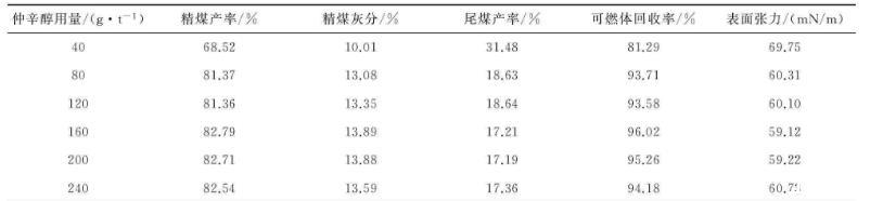 在浮選過程中,煤油作為捕收劑能與煤顆粒作用,影響煤顆粒的潤濕或疏水性;仲辛醇作為起泡劑,能夠在氣—液界面吸附濃集,降低氣—液界面的表面能,生成直徑較小的氣泡,起到起泡作用;煤油和仲辛醇共同使用時,兩種藥劑在氣—液界面有聯合作用,產生共吸附現象[4]。