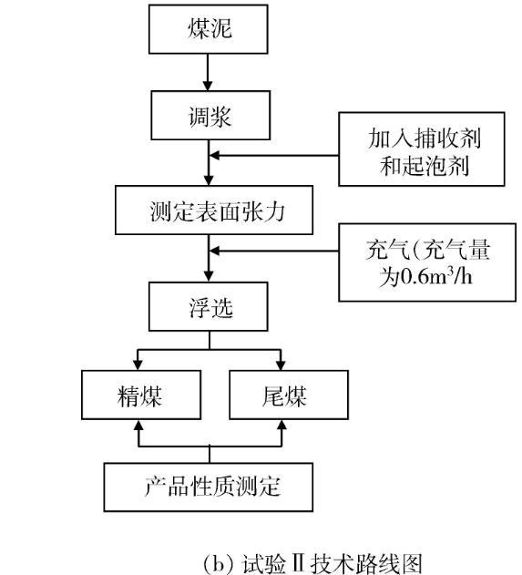 試驗分為試驗Ⅰ和試驗Ⅱ兩部分。在試驗Ⅰ中,先后改變捕收劑和起泡劑用量,對添加浮選藥劑后煤漿的表面張力進行測定,以研究浮選藥劑用量對煤漿表面張力影響的規律。在試驗Ⅱ中選用煤油/仲辛醇做捕收劑/起泡劑,先后改變煤油和仲辛醇的用量,按照《GB/T 4757-2013煤粉(泥)實驗室單元浮選試驗方法》對馬蘭2#煤泥進行浮選試驗,并在浮選充氣前對煤漿同步進行表面張力的測定,進一步對浮選過程中浮選藥劑量、煤漿表面張力及浮選效果之間的關系進行探索。試驗控制煤漿濃度為100 g/L,溫度為22±0.2℃;使用一次去離子水(pH值為7.0±0.2)。試驗技術路線見圖1。