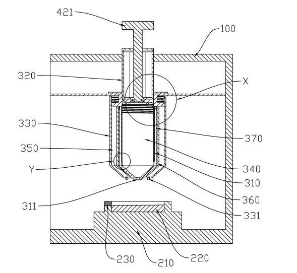 副筒320和滴液筒310之間限定出滴液腔340,滴液筒310上開設有出液口311,滴液腔340與出液口311連通。涂片臺200安裝于外殼100上,出液口311和涂片臺200在第一方向上依次設置,且當出液口311滴出一個待檢測液的液滴時,液滴沿第一方向上靠近涂片臺200的一端能夠與涂片臺200接觸。外筒330上具有第一空腔350,外筒330上開設有進氣口331,進氣口331設置在出液口311外側,進氣口331與第一空腔350連通。滴液筒310繞第一方向轉動能夠分別促使副筒320和外筒330沿第一方向移動,且在進行滴液操作時,副筒320沿第一方向移動能夠使滴液腔340體積變小,外筒330沿第一方向移動能夠使第一空腔350體積變大。