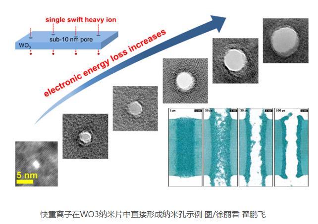 科研人員基于蘭州重離子研究裝置(HIRFL),利用快重離子作用于WO3納米片材料,實現(xiàn)了直接“打孔”的制備方法。同時,科研人員利用分子動力學(xué)模擬對物理機(jī)理進(jìn)行解釋,發(fā)現(xiàn)重離子在材料中的沉積能量會引起材料局域瞬時熔融噴發(fā),以及熔融相的粘度和表面張力大小是決定納米孔形成的關(guān)鍵因素。
