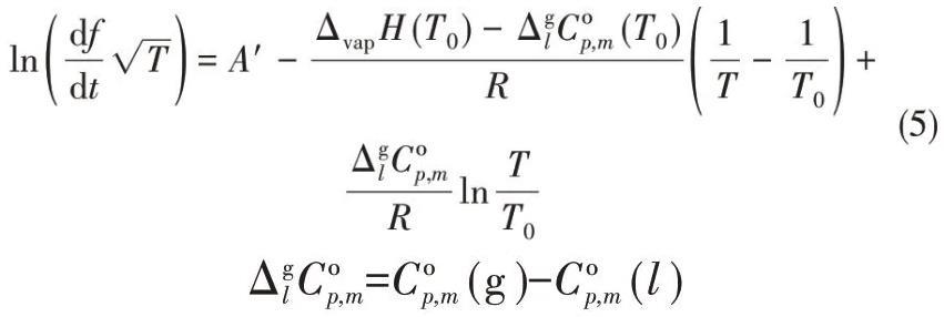 Verevkin等[54]開發了評估程序的物理基礎,并使用1-乙基-3-甲基咪唑雙(三氟甲磺?;?酰亞胺[C2mim][Tf2N]進行測量,從而將蒸發焓的測量范圍降低到363 K。和文獻中已有的數據相比較,具有一致性。這項工作中開發的方法也為得到ILs的汽化焓開辟了一條新途徑。經過一系列公式推導,構建了ILs的摩爾汽化焓、頻率損耗率df/dt和溫度的關系