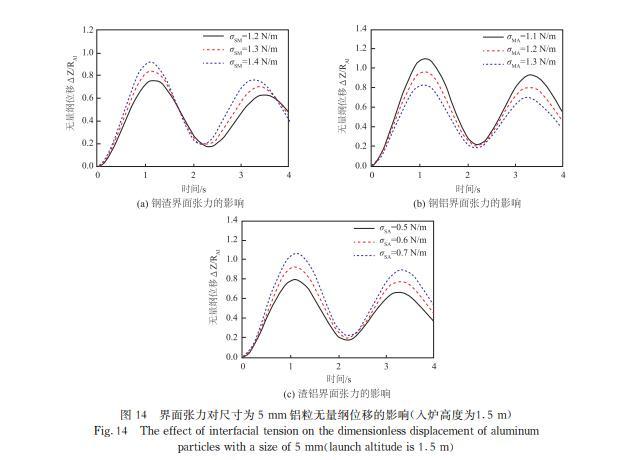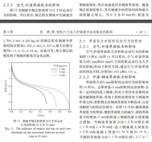 增加鋼渣界面張力、減小鋼鋁界面張力或增加渣鋁界面張力有利于鋁粒進(jìn)入鋼液,而鋁粒的尺寸大于20 mm,界面張力對鋁塊運(yùn)動幾乎沒有影響;增大密度會使鋼芯鋁在鋼液中停留更長時間,有利于鋼液脫氧。