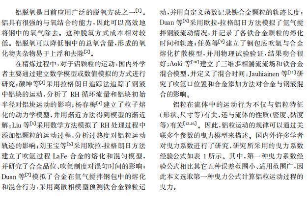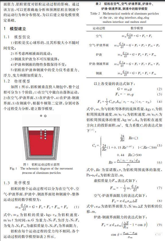 摘要: 二次精煉過程中,鋁是鋼液進(jìn)行脫氧及合金化的主要物料之一,但純鋁的密度小于鋼液,能否穿越渣層與鋼液接觸及接觸時間對鋁的脫氧效果和鋼中溶解鋁的含量有直接影響。在忽略鋁的熔化、溶解及化學(xué)反應(yīng)的情況下,通過對鋁粒運(yùn)動過程受力分析,建立鋁粒在氣-渣-鋼相內(nèi)的三維運(yùn)動數(shù)學(xué)模型,明晰鋁粒尺寸及入爐高度對鋁粒運(yùn)動軌跡的影響。
