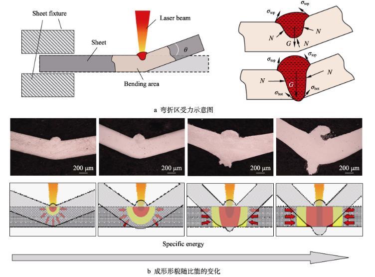 通過觀察激光熱應(yīng)力成形過程中彎折處的形貌發(fā)現(xiàn),激光熱輸入、彎曲角度和成形機制會影響彎折區(qū)材料表面的擠壓、熔化、流動和凝固過程,以及材料內(nèi)部的溫度梯度和界面表面張力,這些影響導(dǎo)致彎折區(qū)域的輪廓形貌、粗糙度、顯微組織、硬度分布發(fā)生變化。在激光熱應(yīng)力成形過程中,熔池的受力情況如圖1a所示。一方面,當(dāng)比能較小且熔凝區(qū)僅存在金屬板上表面時,薄板彎折處的增厚主要受到左右兩側(cè)和下側(cè)冷端材料的約束作用,通過作用于上側(cè)材料,且上表面局部熔化的材料在頂端表面張力的作用下,形成了頂部凸起的形貌。同時,由于激光瞬態(tài)作用時間較短,熔融材料在激光掃描結(jié)束后快速凝固,并在掃描次數(shù)逐漸增加的過程中形成連續(xù)隆起的形貌,在彎折處形貌演變過程中粗糙度逐漸增大。在高比能下,薄板彎折處材料的熔化凝固和塑性變形受到左右兩側(cè)材料的橫向約束,該區(qū)域在左右兩側(cè)材料的擠壓下增厚。