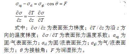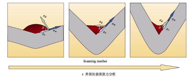 通過對成形過程彎折區(qū)域材料的溫度梯度和界面表面張力進行分析可知,激光熱應(yīng)力成形界面處的表面張力與潤濕角θ的關(guān)系可用楊氏方程表示,見式(1)。在成形結(jié)束后,界面表面張力的矢量和為零,同時熔凝層表面張力與溫度梯度存在如式(2)所示的關(guān)系。