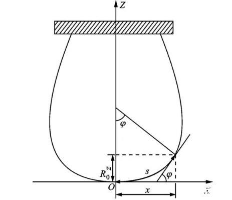 懸滴法利用測定處于重力與表面張力平衡狀態的液滴外形,獲得待測液體的表面張力。懸滴外形的幾何關系如圖1所示,在考慮液體靜壓作用的基礎上,由經典Young-Laplace方程推導得歸一化Bashforth-Adams工作方程為,式中:σ為表面張力;φ表示外形輪廓線某點切線與橫坐標夾角;s為弧長;R0為頂點曲率半徑;ρl、ρg分別表示液相和氣相密度;g代表當地重力加速度,本文取為9.7965 m·s-2。