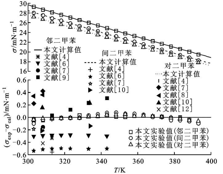 圖4鄰二甲苯、間二甲苯和對二甲苯表面張力與溫度關系以及與方程計算值和文獻值比較