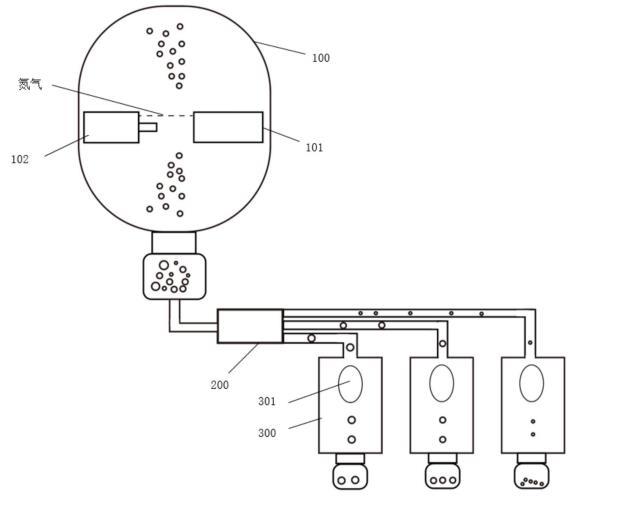 一種制備高氮鋼粉末的裝置,包括霧化室100、氮氣吹送裝置(圖中未示出)、粉末分離裝置200以及后處理裝置300。