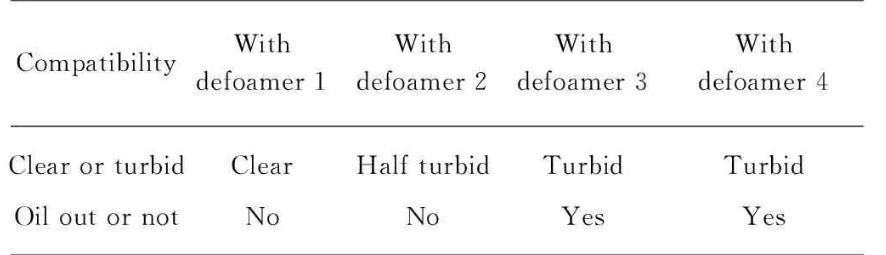 表2是消泡劑與起泡液的相容性。由表2可見:消泡劑1與起泡液有很好的相容性;消泡劑2與起泡液相容性一般。與消泡劑1相比,消泡劑2中的有效成分含量為100%,遠(yuǎn)高于消泡劑1的25%.由此可見,對(duì)炔二醇改性的消泡劑與起泡液的相容性與其有效成分是成反比的。由表2還可見,消泡劑3和4與起泡液的相容性都很差,這與油的不相容性有關(guān),加入起泡液中會(huì)形成部分乳化和部分漂浮,形成渾濁液。
