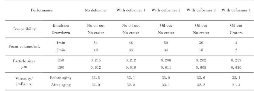 表3消泡劑對(duì)水性丙烯酸膠黏劑乳液性能的影響