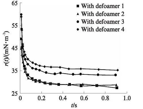 圖1是添加消泡劑后起泡液(0.2%二異辛基琥珀磺酸鈉鹽水溶液)的動(dòng)態(tài)表面張力r(t)與時(shí)間t的關(guān)系圖。由圖1可以看出:在同樣的添加量下,分子級(jí)消泡劑(消泡劑1、2)可使起泡液具有更低的動(dòng)態(tài)表面張力,這與其雙子結(jié)構(gòu)有關(guān);有機(jī)消泡劑(消泡劑3、4)在起泡物質(zhì)的協(xié)同作用下,也具有一定的降低起泡液動(dòng)態(tài)表面張力的能力;在起泡液中,不論是加入分子級(jí)消泡劑還是有機(jī)消泡劑,在時(shí)間趨于1s時(shí),其表面張力都低于36mN/m.