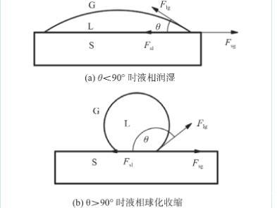 潤濕角θ的大小直接反映了液相對固體表面的潤濕程度,θ越小,潤濕性就越好。當θ為0°時,表示完全潤濕,小于時為潤濕狀態,而大于時為不潤濕狀態。由于相同體積下,球形的表面積最小,表面張力驅使液體聚集到最小表面積狀態,在釬料熔化后便聚合在一起收縮成球狀,從而發生液態釬料聚合現象。