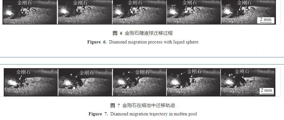 圖6所示為金剛石在液態球上的運動軌跡。隨著激光熱作用,釬料首先熔化成小液滴,然后匯聚成小球,由圖6可以看出,金剛石在液態小球上不穩定的運動,以致可以見到金剛石表面亮度很高的閃光,這是金剛石反射的激光。圖7是激光釬涂過程中,金剛石在釬涂熔池中的運動路徑。金剛石顆粒首先存在于熔池邊緣底部,隨著釬涂過程的進行,金剛石顆粒沿熔體球面逐漸向上部運動,然后在熔池表面向后方移動,當激光熱源遠離,熔池開始凝固,金剛石顆粒被固結于涂層近表面位置,保持一定的出刃高度,有利于發揮耐磨作用。金剛石運動總趨勢是沿液態球表面或熔池邊緣向液/氣界面遷移。