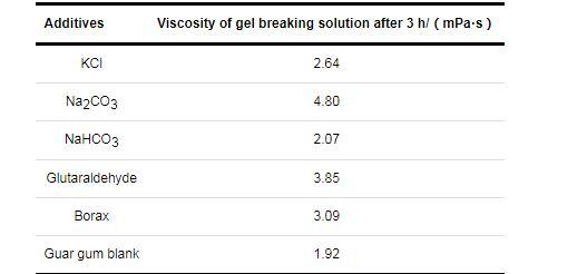 在壓裂過(guò)程中選擇生物酶作為破膠劑,必須要保證酶與不同壓裂液添加劑間的配伍性。按1.2.7小節(jié)中壓裂液配方,將ME-O5分別與只含有KCl、Na2CO3、NaHCO3、戊二醛、硼砂和瓜爾膠添加劑的瓜爾膠溶液混合,破膠3 h后測(cè)定其破膠液的粘度。ME-O5在不同壓裂液添加劑下的破膠情況如表2所示。由表2可知,各種壓裂液添加劑與ME-O5均沒(méi)有配伍禁忌,3 h后破膠液的粘度均下降至5 mPa·s以內(nèi),具有良好的配伍性。