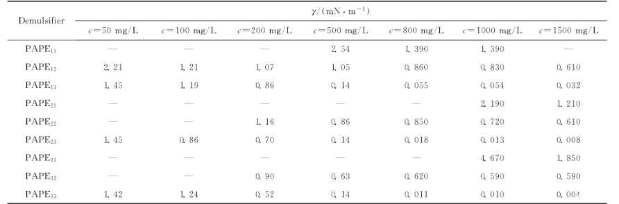 PAPE11、PAPE12和PAPE13是相對(duì)分子質(zhì)量相當(dāng)、HLB值逐漸增大,亦即其親水性逐漸增強(qiáng)的3個(gè)破乳劑樣品。從表3還可以看出,在同樣的破乳劑濃度下,HLB值越大的破乳劑降低油-水界面張力的幅度越大,油-水界面張力越低,甚至發(fā)生數(shù)量級(jí)的變化;而要將油-水界面張力降低至同樣的水平,HLB值大的破乳劑所需要的濃度則更低,即其降低油-水界面張力的效率越高。PAPE21、PAPE22和PAPE23以及PAPE31、PAPE32和PAPE332個(gè)系列的破乳劑隨著HLB值的增大也表現(xiàn)出同樣的規(guī)律。PAPE12、PAPE22和PAPE32是保持HLB值相當(dāng)、相對(duì)分子質(zhì)量逐漸增大的3個(gè)破乳劑樣品,隨著相對(duì)分子質(zhì)量的增大,它們降低油-水界面張力的能力均有所增強(qiáng),但增強(qiáng)的幅度不大,大體均在同一數(shù)量級(jí)內(nèi)變化。PAPE13、PAPE23和PAPE33是水溶性最好的一組破乳劑,隨著相對(duì)分子質(zhì)量的增大,其降低油-水界面張力的能力也有所增強(qiáng),但增強(qiáng)幅度仍然不大。由此可見,在所研究的破乳劑相對(duì)分子質(zhì)量變化范圍內(nèi),相對(duì)分子質(zhì)量變化對(duì)PAPEmn界面活性的影響較小。