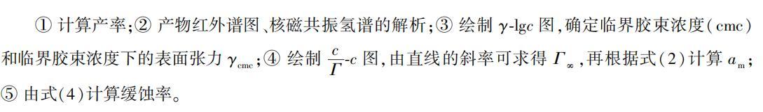 儀器:NEXUS470傅立葉紅外光譜儀,Bruker AVANCE III核磁共振儀,R-1002旋轉蒸發儀,WRS-1B數字熔點儀,DZ-2BC真空干燥箱,JJ-1電動攪拌器,恒溫水浴鍋,JK99B自動張力儀,BS-210S電子天平,干燥器,N80鋼片(長伊寬伊高=40mm伊13mm伊2mm),醫用紗布,毛刷,醫用金屬鑷子,脫脂棉,綢子,鐵砂紙,250mL三口燒瓶1只,回流冷凝管等。