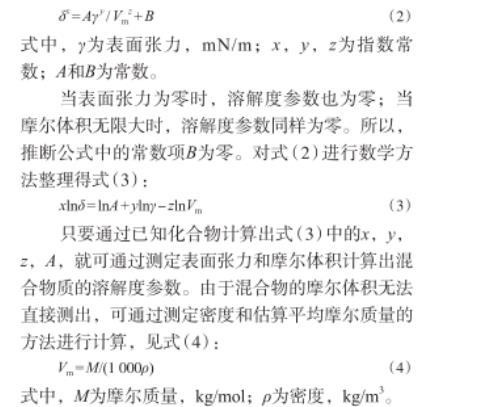 只要通過已知化合物計算出式(3)中的x,y,z,A,就可通過測定表面張力和摩爾體積計算出混合物質的溶解度參數。由于混合物的摩爾體積無法直接測出,可通過測定密度和估算平均摩爾質量的方法進行計算,見式(4):