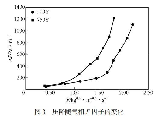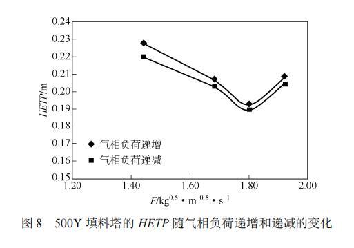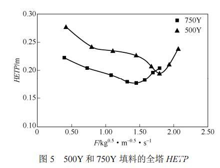 (1)在一定負荷范圍內,750Y填料的分離效率優于500Y填料,但單位填料高度的壓降高于500Y填料,導致操作穩定性比500Y填料差,處理量比500Y填料小。