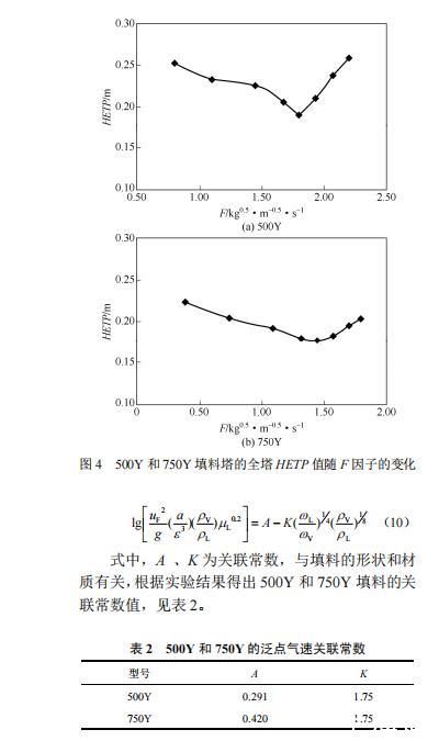 (2)實驗測定了氣相負荷從小到大直至液泛的流體力學性能和傳質性能,得到了液泛時的實驗數據,給定了操作的極限。500Y規整填料塔的最大F因子Fmax=1.8kg0.5/(m0.5·s);750Y規整填料塔的最大F因子Fmax=1.5kg0.5/(m0.5·s)。對于正庚烷-甲基環己烷物系,500Y填料的泛點氣速為uF=0.98m/s,750Y填料的泛點氣速為uF=0.82m/s。并由實驗結果擬合出貝恩(Bain)-霍根(Hougen)關聯式中常數A、K的值。對于500Y填料A=0.291,K=1.75;對于750Y填料A=0.420,K=1.75。