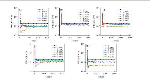 在高濃度時,這些組分獲得了更高的能量去克服油水界面能壘。因此,這些組分能夠更快地擴散到界面,并與p-S14-4分子在界面上無序排列。當形成最緊密的混合吸附膜時,使IFT達到最小。隨著時間的延長,p-S14-4分子和這些組分由無序排列變為有序排列,導致IFT增加直至達平衡。此情況下,IFTmin不等于IFTequ,DIFTs曲線呈“V”型。IFTmin不僅與瀝青質組分的分子尺寸有關,還與極性有關。瀝青質及其亞組分的分子尺寸越小,向界面擴散的速度越快;極性越高,界面活性越強,越有利于縮小油水兩相性質差異。因此,既有較小的分子尺寸又有較高極性的瀝青質及其亞組分導致IFTmin變得更低。
